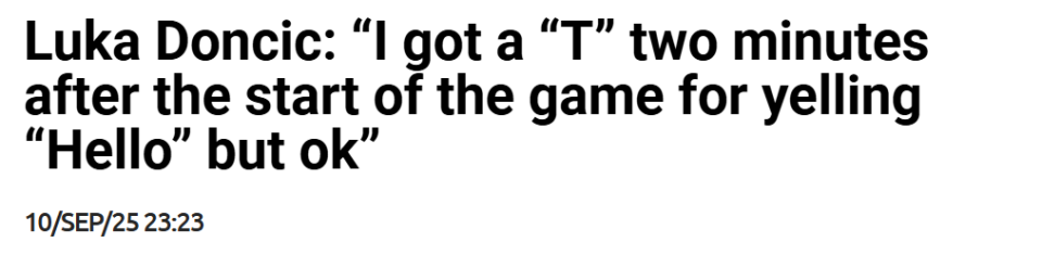 不过,真正让东契奇怒火中烧的是比赛初期的几次判罚——此前他便多次因裁判判罚表达不满。赛后接受斯洛文尼亚《体育电视台》采访时,他说道:“这事儿只能……我还是不说了。比赛刚进行两分钟,我就因为喊了声‘喂’(‘alo’,类似英语‘hello’)吃到了一次技术犯规,不过也没什么好说的。在1/4决赛这种级别的比赛里,不管你是谁,都不该出现这种情况。要是连个警告都没有就直接吹罚,那我真的无法理解。但这可是1/4决赛啊,大家都在为晋级半决赛拼尽全力,所以我实在搞不懂他们为什么会这么吹……”