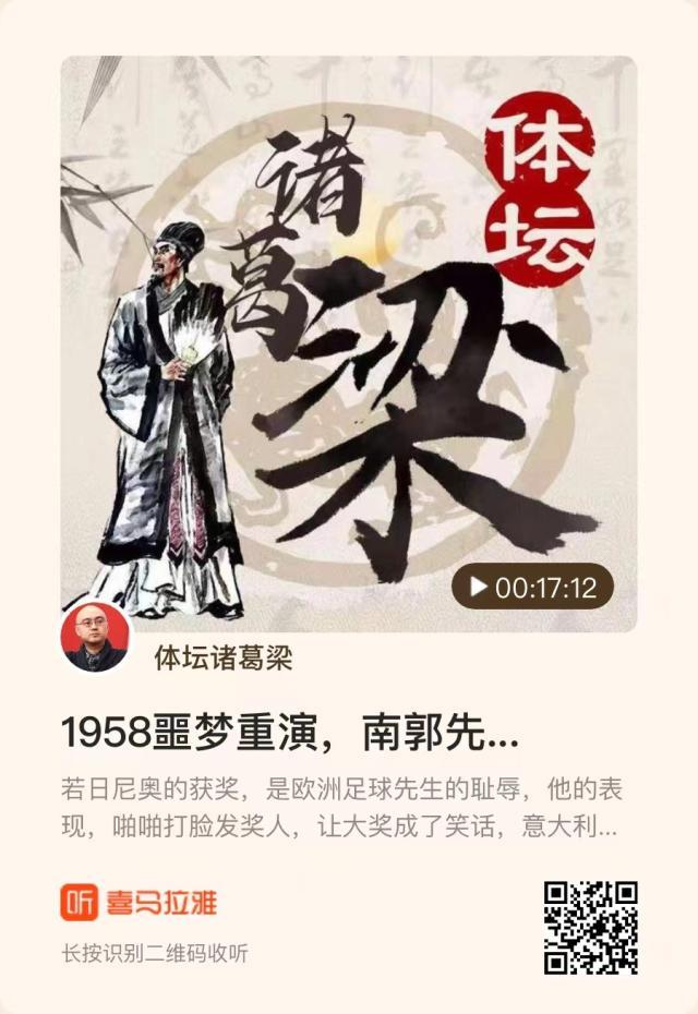由《体坛周报》与喜马拉雅FM联合推出的播客节目——《体坛诸葛梁丨梁熙明电台》正式上线。 若日尼奥的获奖,是欧洲足球先生的耻辱,他的表现,啪啪打脸发奖人,让大奖成了笑话,意大利说不定就死在这位先生手里 点击下方链接,或扫描二维码,即可进入“体坛诸葛梁”收听节目,与梁熙明就足坛热点展开交流...